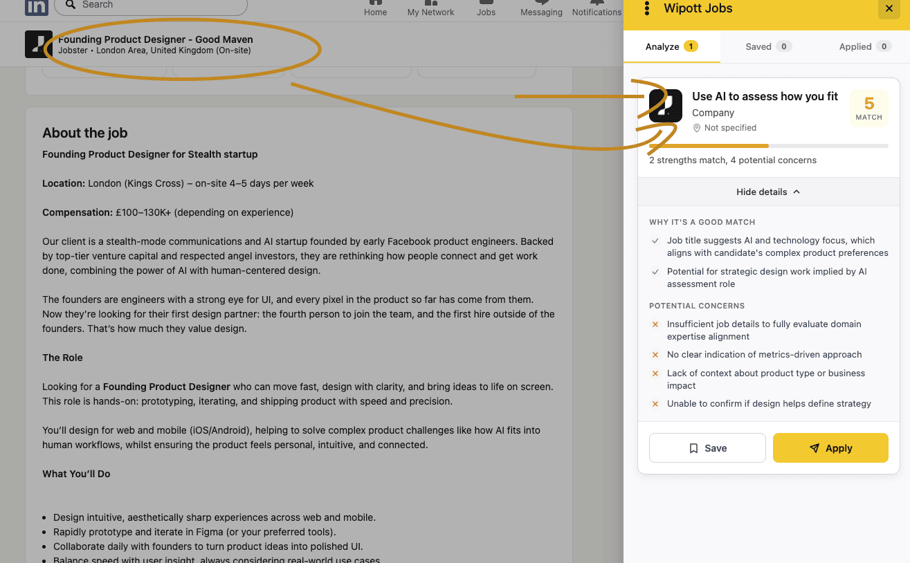 I structured that bio into JSON and built a Chrome extension called Wipott Jobs. The mechanics were simple: go to LinkedIn, look at a job posting, click once, and the extension returns: